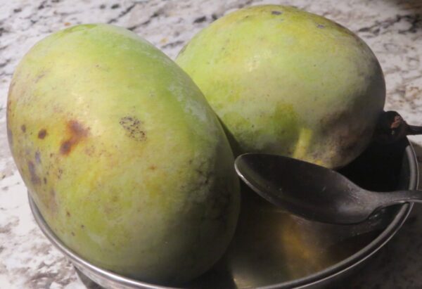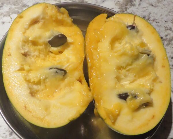 The tree produces high yields of large-sized (8-12 ounce) fruits that can grow up to a pound each. It has light yellow/orange flesh and a thick, dense, custard texture while the flavor is pleasantly mild and sweet with very little to no aftertaste.